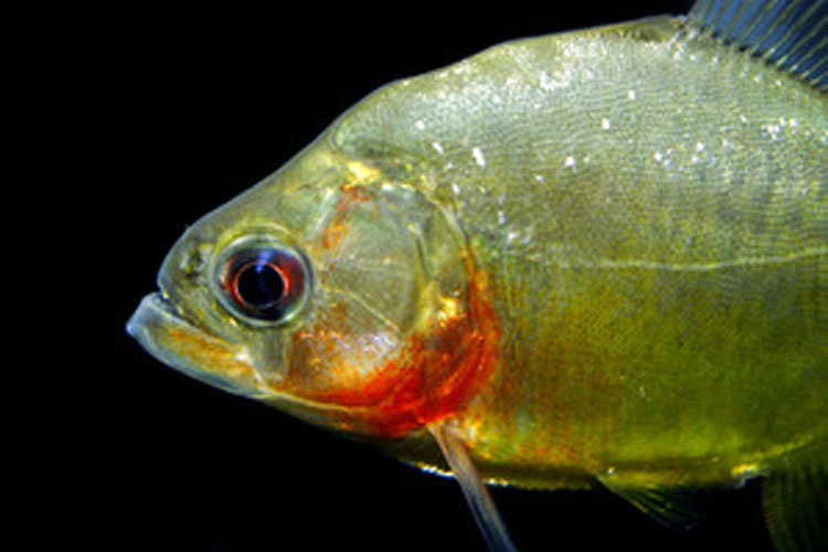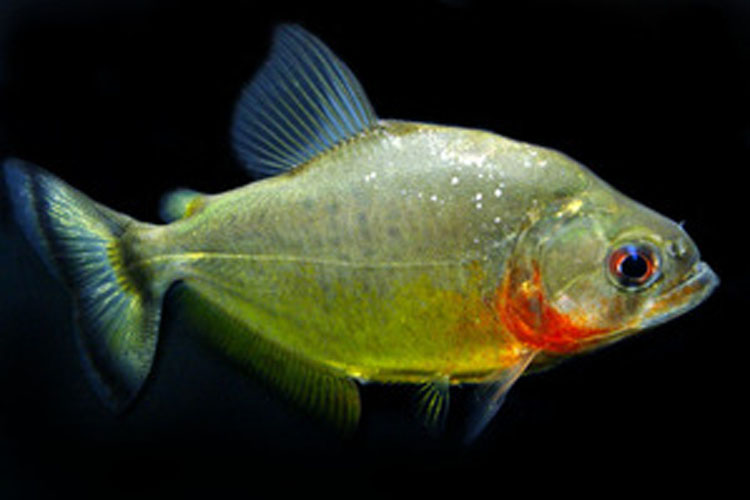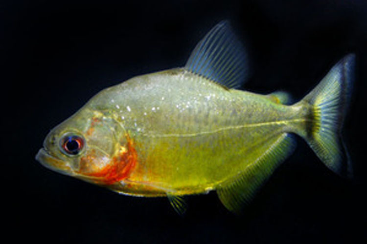 “一昨年新登場してピラニアマニアの間で話題になった新着のピラニア。トカンチンス固有の種で、下顎後部からエラ周辺にかけて発色よい赤色を呈し、側線下腹部から尾ビレのかけて広がるイエローゴールドは非常に美しい。強い光を当て撮影すると左画像のように美しく写る。