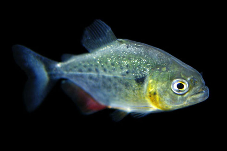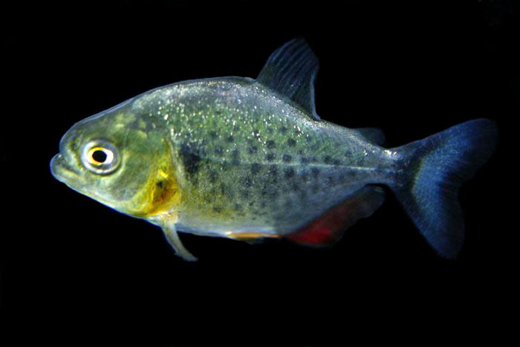 ナッテリーに似るがエラ蓋の後方に黒点が出ることから見分けは容易。主にコロンビア、ベネズエラから入荷し、ピラニアの中でナッテリーなどと同じく比較的混泳が可能。尻ビレは血のような赤に染まり、価格的にも人気がある。人工飼料にも慣れやすく、飼育もし易い。