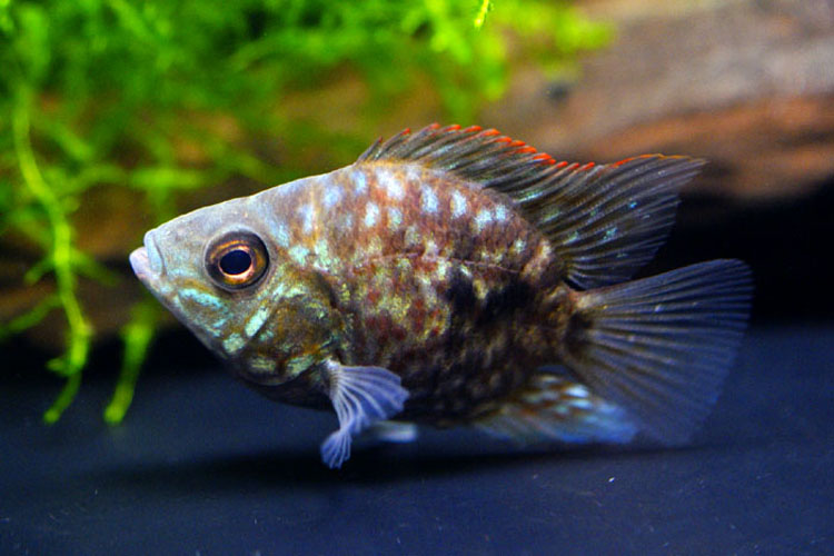 コロコロした体型で可愛い。原種は非常に丈夫な強権種として知られ、東南アジアで盛んにブリーディングされる。フラワーホーンの原種の一つともなった青いシクリッド。きらきらしたラメが目を引きます。