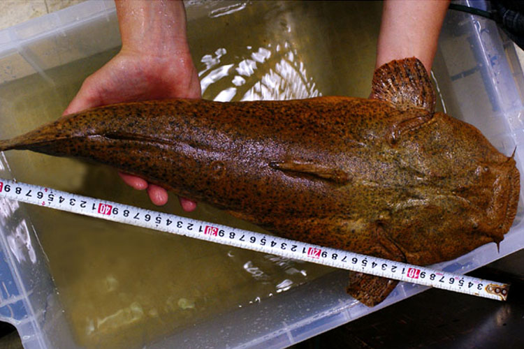 最大で50~80cmにまで成長する。頭がつぶれたような奇妙な顔つきの大型ナマズ。つぶらな瞳・大きな口、他にはない独特のかわいらしさを持つ。餌は、主に魚で水底にじっとして通りかかる獲物を一瞬で捕食する。慣れると人工飼料なども好んで食べる。