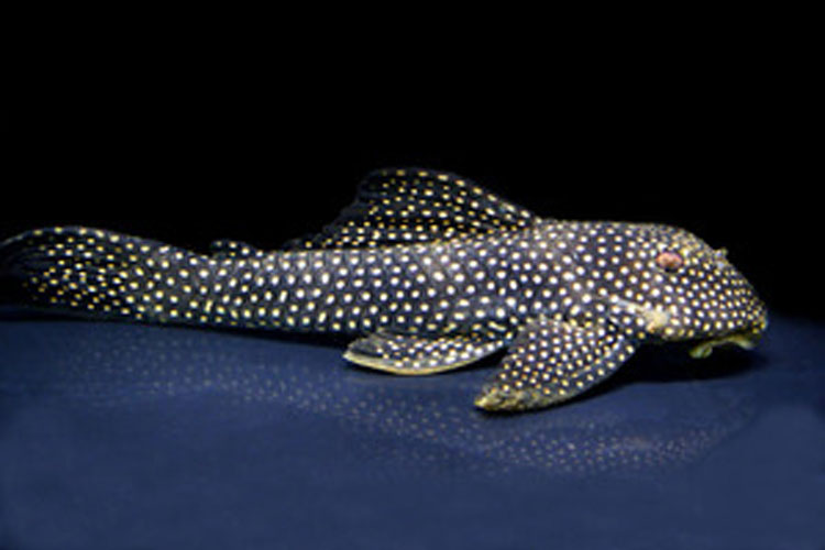 全身に満天の星空を写し込んだようなゴージャスなマグナム系プレコ。成魚に見られるその細かなスポットは幼魚時には体比率的に大きく、間隔も広い。頭部は台形で角ばり、がっしりした感がある。良く似た種に「トパーズドットマグナムプレコ」が存在するが、生息域が別で、腹部にも模様を持つことで区別ができる。本商品はスポットがバランスよく入ったAグレードの個体である。