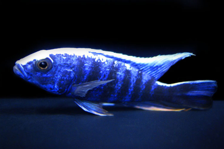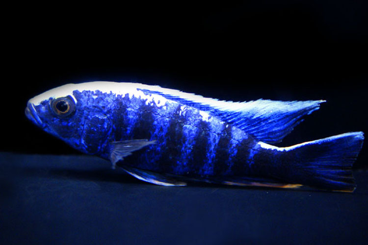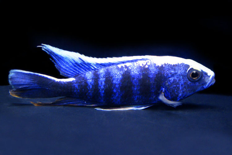 アフリカンシクリッドの中ではおそらく 人気・知名度・美しさ でナンバー1であろう マラウィ湖原産の代表種。オスの全身を包むメタリックブルーは比類無き美しさである。「スキアエノクロミス アーリー」と混同され続け 現在も通り名になっているが、「フライエィ」が正解である。世界各地で養殖繁殖され、様々なタイプが流通しているが、本個体は吻先端から背部、尾ビレにかけて白~乳白色の太いラインで縁取られる「シルバー(ホワイト)トップ」と呼ばれる美しい品種の一つである。
