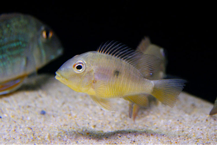 成熟したオスの頭部は丸く扁平で盛り上がるという特徴的なスタイルを持つ「ゲオファーガス類」の一種。黄色味がかった体色も美しく、このグループの中では特異的な存在である。縄張り意識が強い割には臆病なところもあるので、落ち着ける環境を用意し、じっくり飼い込みたい。