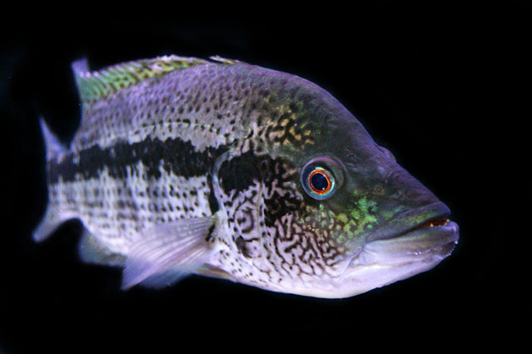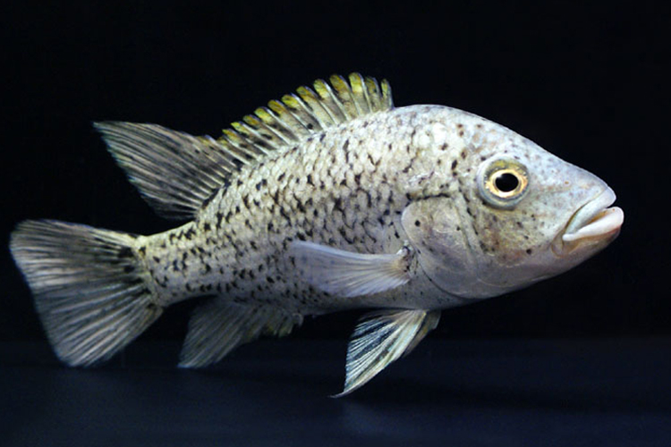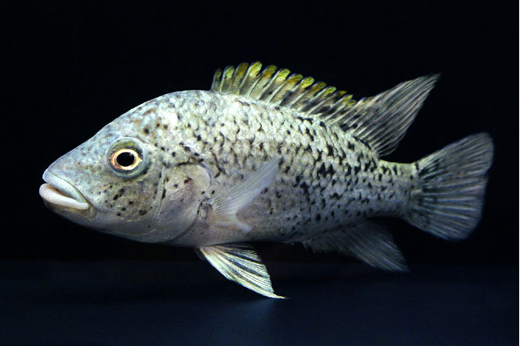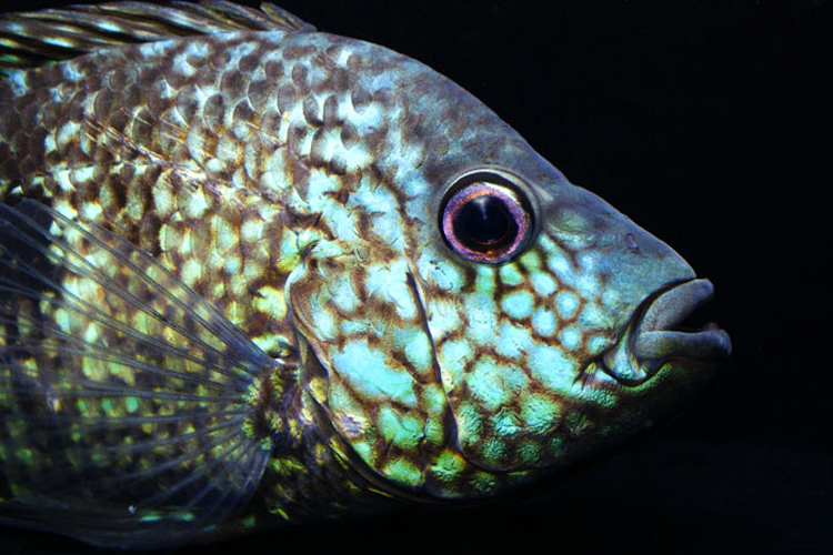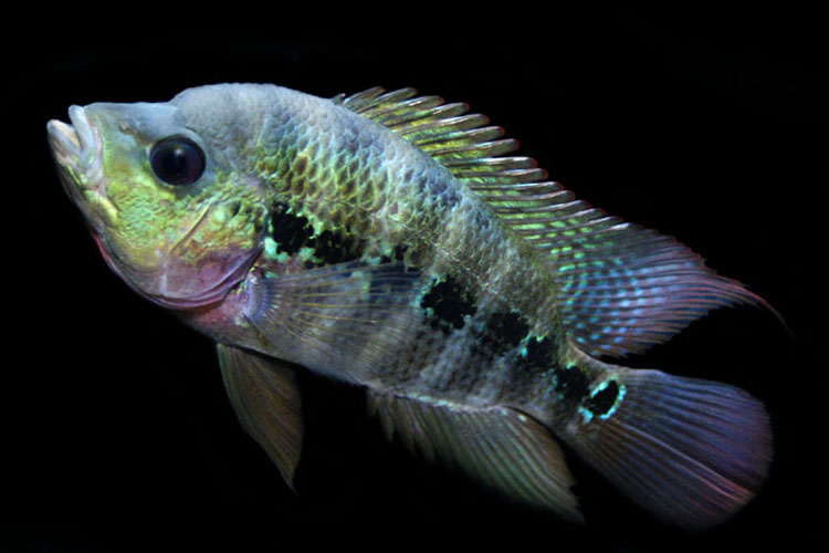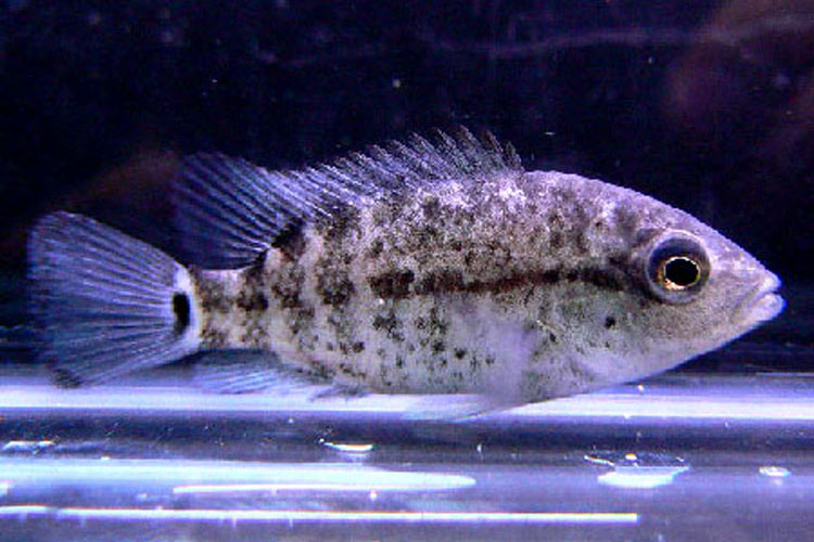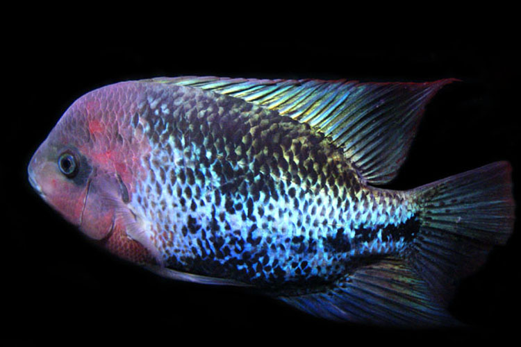 シクラソマ(中南米産シクリッド総称)の中でもサウスと並んで最大種の一つとして知られる大型種。英名はレインボーバス。体色はシルバーで各ヒレはブルーに染まり、体を細かなブラックスポットが覆う。ごついアゴと牙が風格を漂わせる。性格は荒々しく排他的。喧嘩も強く、シクラソマ界ビック3(サウス、フラミンゴ、ドヴィー)にノミネートされる。背ビレ第3、4棘条あたりの欠損が残念であるが、そのへんはご愛嬌としてとらえていただければ幸いである。