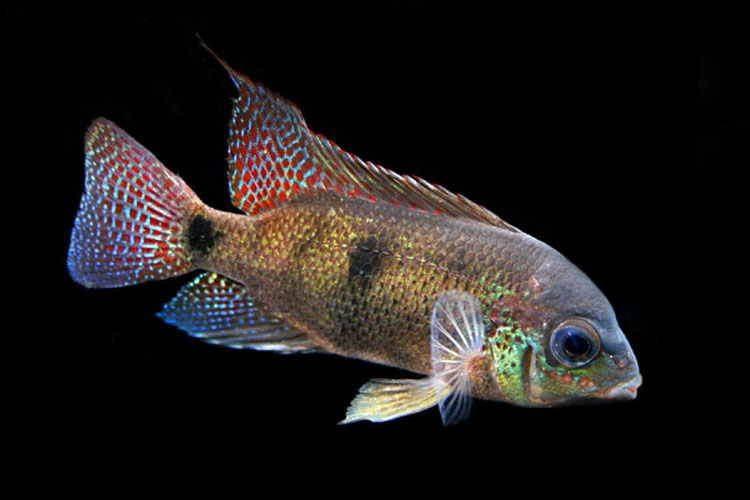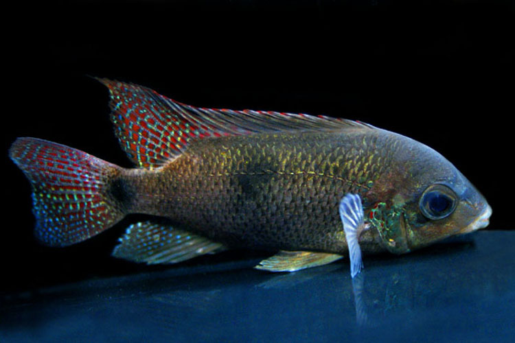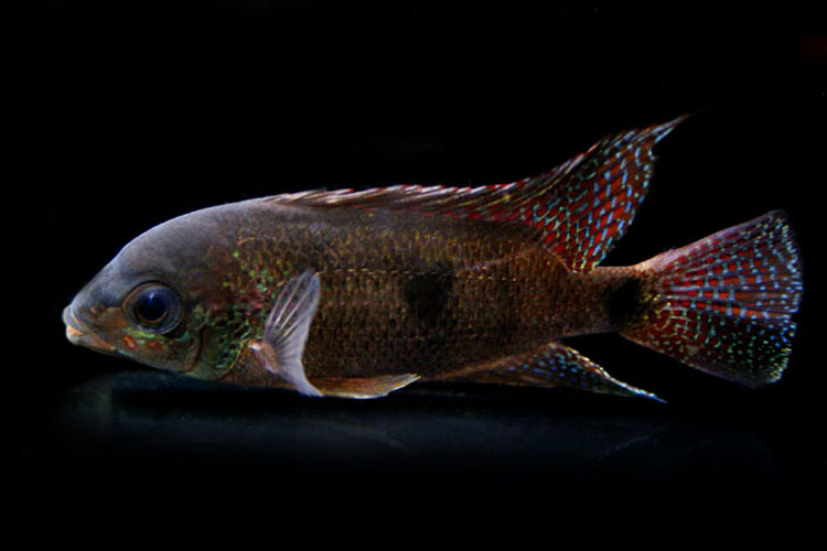 パラテラプスの仲間は丸い体系と派手な色彩が特徴でほかにビファシアータ、ゾナタスなどが知られている。シクラソマ類は青や赤で全身をきらめかせ、これでもかと個性のある目立ちたがり屋な魚です。性格は荒々しく排他的。しかし単独でも十分に飼育者を満足させてくれるだろう。水質は弱アルカリを好む。写真の個体をお送りいたします。サイズには多少の差異があります。オス個体です。