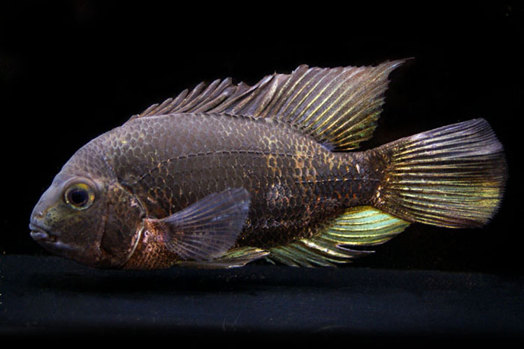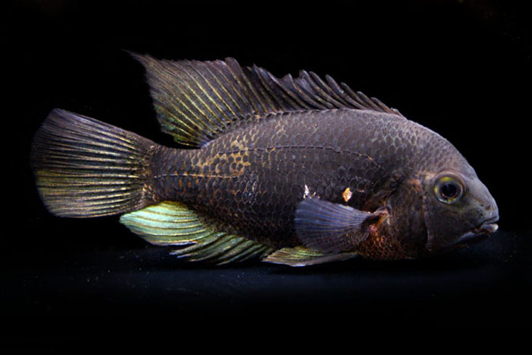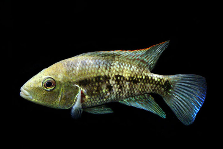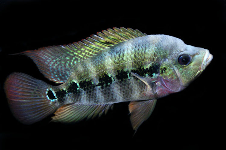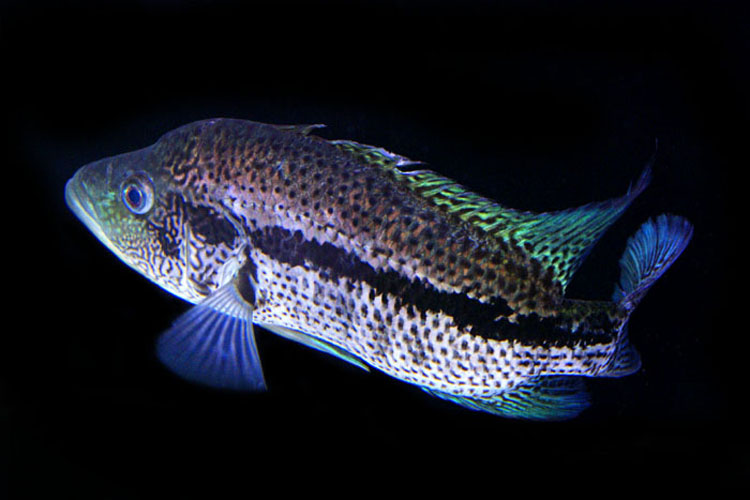 「アンフィロフス」の仲間では「Am.トリマキュラータ」がメジャーであるが、この「リオンシー」も外せない存在である。体側には太く不鮮明な帯が等間隔に入り、眼後部より尾ビレにかけて不定形な黒班が断続的に並ぶ。その班の外縁はメタリックブルーに縁取られ個体によっては非常に目立つ。また成熟した雄は状態が良いと淡いメタリックブルー~グリーンを全体的に呈し、胸ビレ基底部付近と背ビレ後部端、尾ビレをほんのりピンク色に染め何とも美しい。バランスの良い体型と大きくなりすぎないサイズが人気の一つでもある。じっくり飼い込みたい種である。