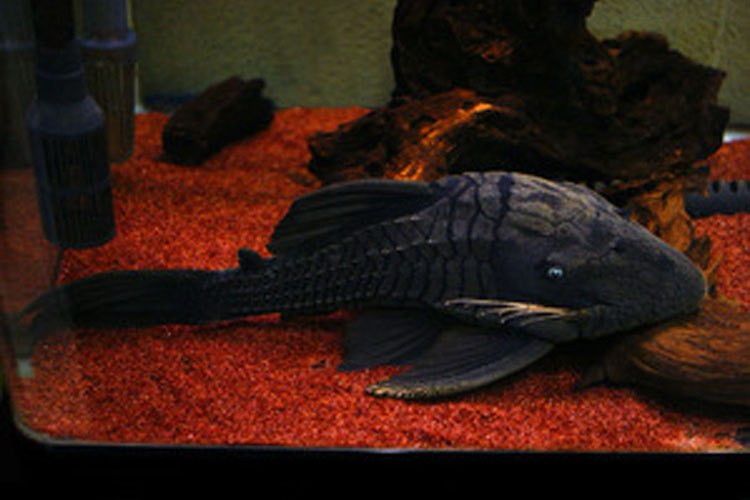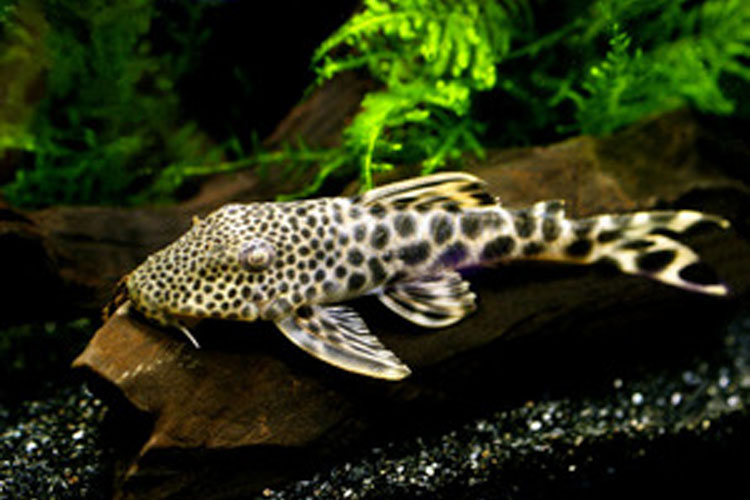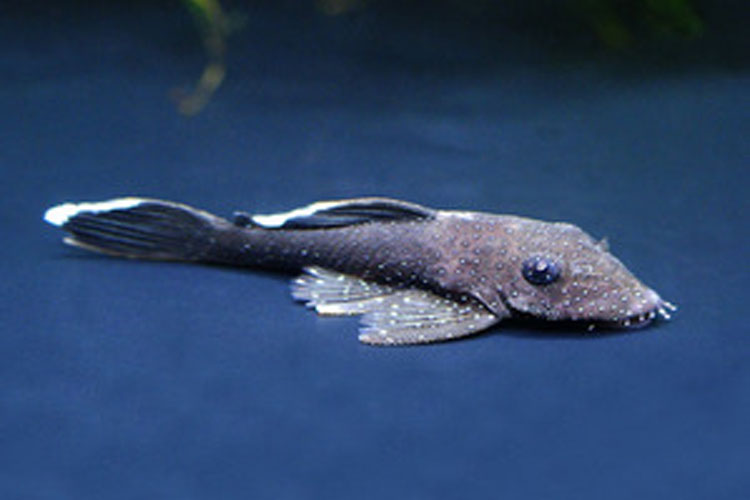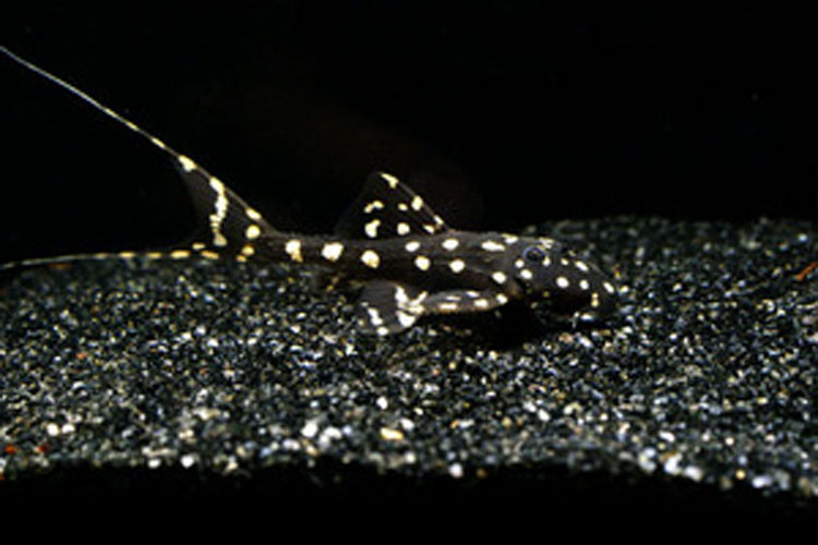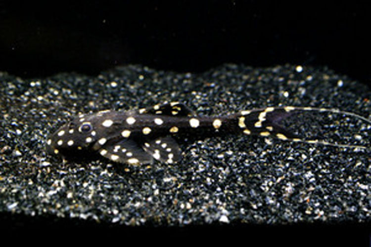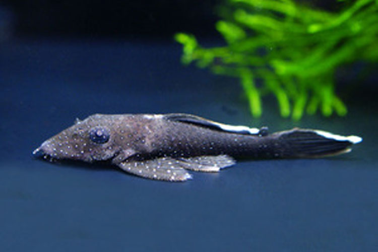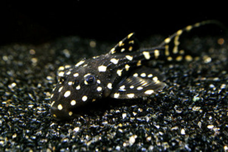 漆黒の体に全身にちりばめられた白いスポットが人気の高いプレコ。大型になることで知られ、成長に伴いスポットは消失する。