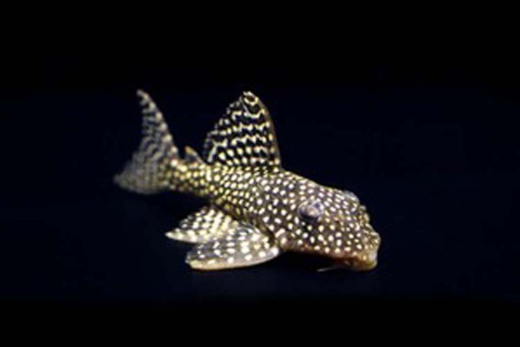真っ黒な魚体にやや黄色身がかったスポットをを持つ美しい小型プレコ。