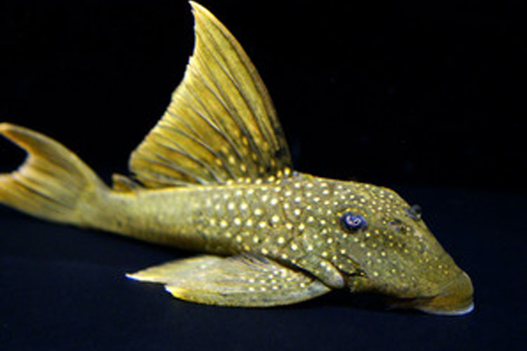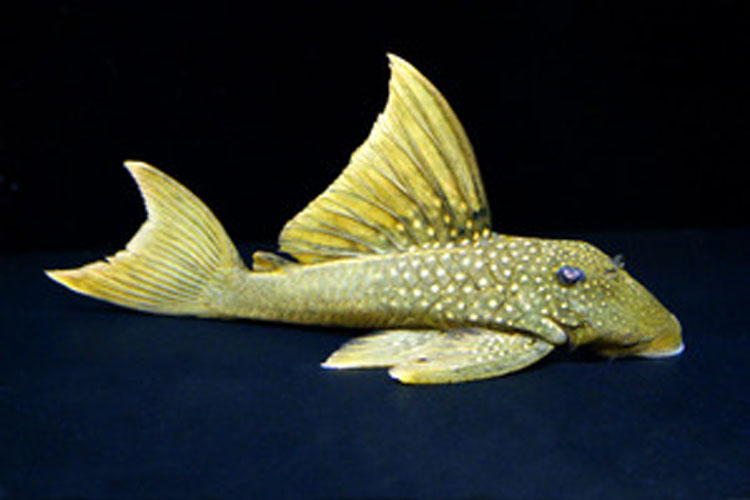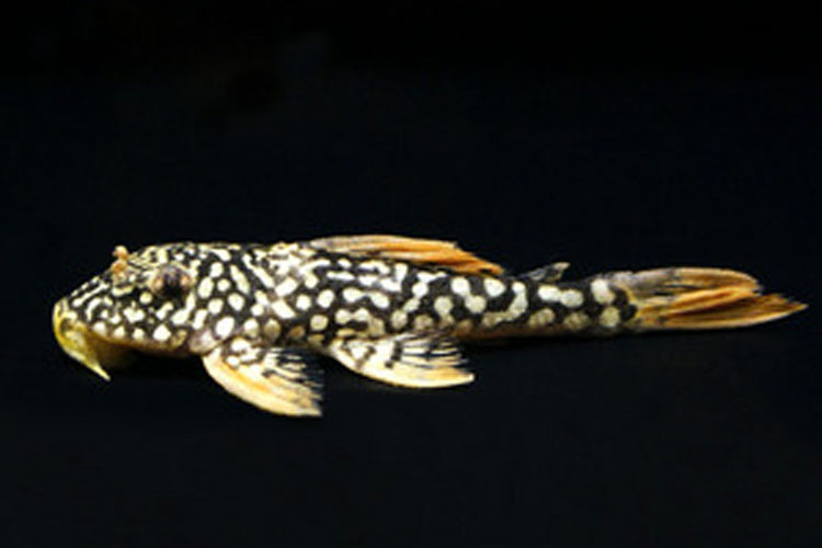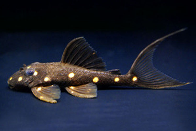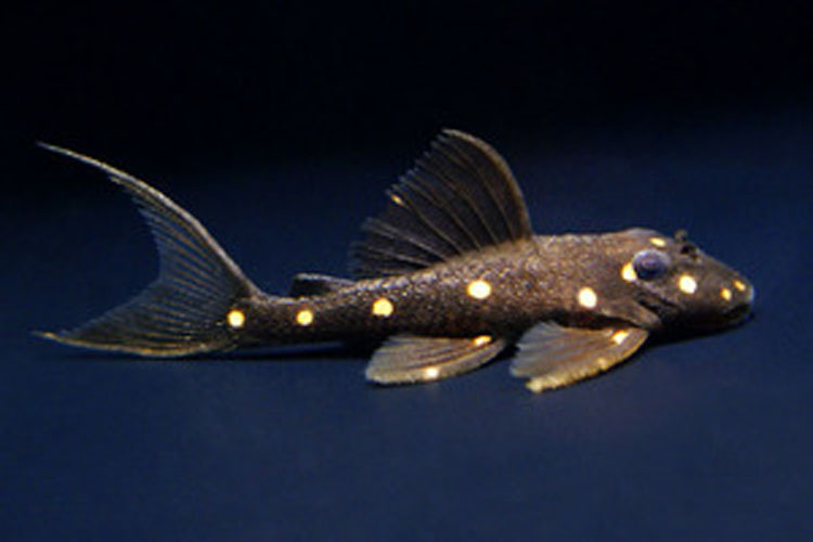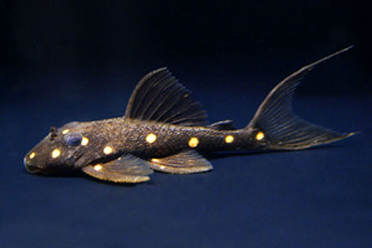 全身大粒のスポット(個体差有)に身を包んだロイヤルプレコ。かつては別種として扱われていたが、現在は色彩変異個体とされている。盛りあっがた特徴的な体型は「ロイヤルプレコ」のそれと似ているが、ややずんぐりした感じであろうか。流木の下や薄暗いところが好きで、同種間や他のプレコといさかいを起こすこともあるので、隠れ家を多めに用意すると良いであろう。野生下では流木やコケをかじっている。大型個体はアクリル水槽に傷をつけるので注意したい。輸入は不定期で数も少ないのであまり見かけることのない珍しいプレコである。